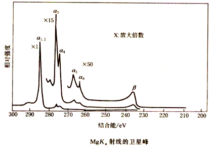 用来照射样品的单色x射线并非单色,常规Al/Mg ka 1,2 射线里混杂能量略高的Kα3,4,5,6 和Kβ射线,它们分别是阳极材料原子中的L2和L3能级上的6个状态不同的电子和M 能级的电子跃迁到K 层上产生的荧光X射线效应。这些射线统称XPS卫星线,所以导致XPS中,除Kα1,2所激发的主谱外,还有一些小的伴峰。