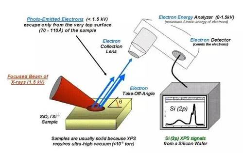 仪器材料的功函数Φ是一个定值,约为 4 eV,入射X光子能量已知,这样,如果测出电子的动能Ek,便可得到固体样品电子的结合能。各种原子,分子的轨道电子结合能是一定的。因此,通过对样品产生的光子能量的测定,就可以了解样品中元素的组成。元素所处的化学环境不同,其结合能会有微小的差别,这种由化学环境不同引起的结合能的微小差别叫化学位移,由化学位移的大小可以确定元素所处的状态。例如某元素失去电子成为离子后,其结合能会增加,如果得到电子成为负离子,则结合能会降低。因此,利用化学位移值可以分析元素的化合价和存在形式。